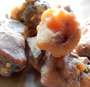 - گوند (Gum): تقریباً 25 فیصد۔ اس میں “گلوکوز (Glucose)”، “گلیکٹوز (Galactose)”، “ایل-عریبینوز (L-arabinose)”، “رامنوز (Rhamnose)”، اور “گلوکیورونک ایسڈ (Glucuronic acid)” شامل ہیں۔