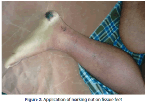 ایک جوڑے نے مارکنگ نٹ بلادر کے عرق کو اپنے پھٹے پیروں پر استعمال کیا، جس کے نتیجے میں جلد پر شدید خارش، جلن، اور زخم پیدا ہوئے۔