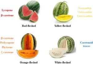 تربوز پھل: بیرونی چھلکا سبز رنگ کا ہوتا ہے، جبکہ اندر کا گوشت میٹھا ہوتا ہے اور اس کا رنگ سرخ، پیلا یا گلابی ہو سکتا ہے۔