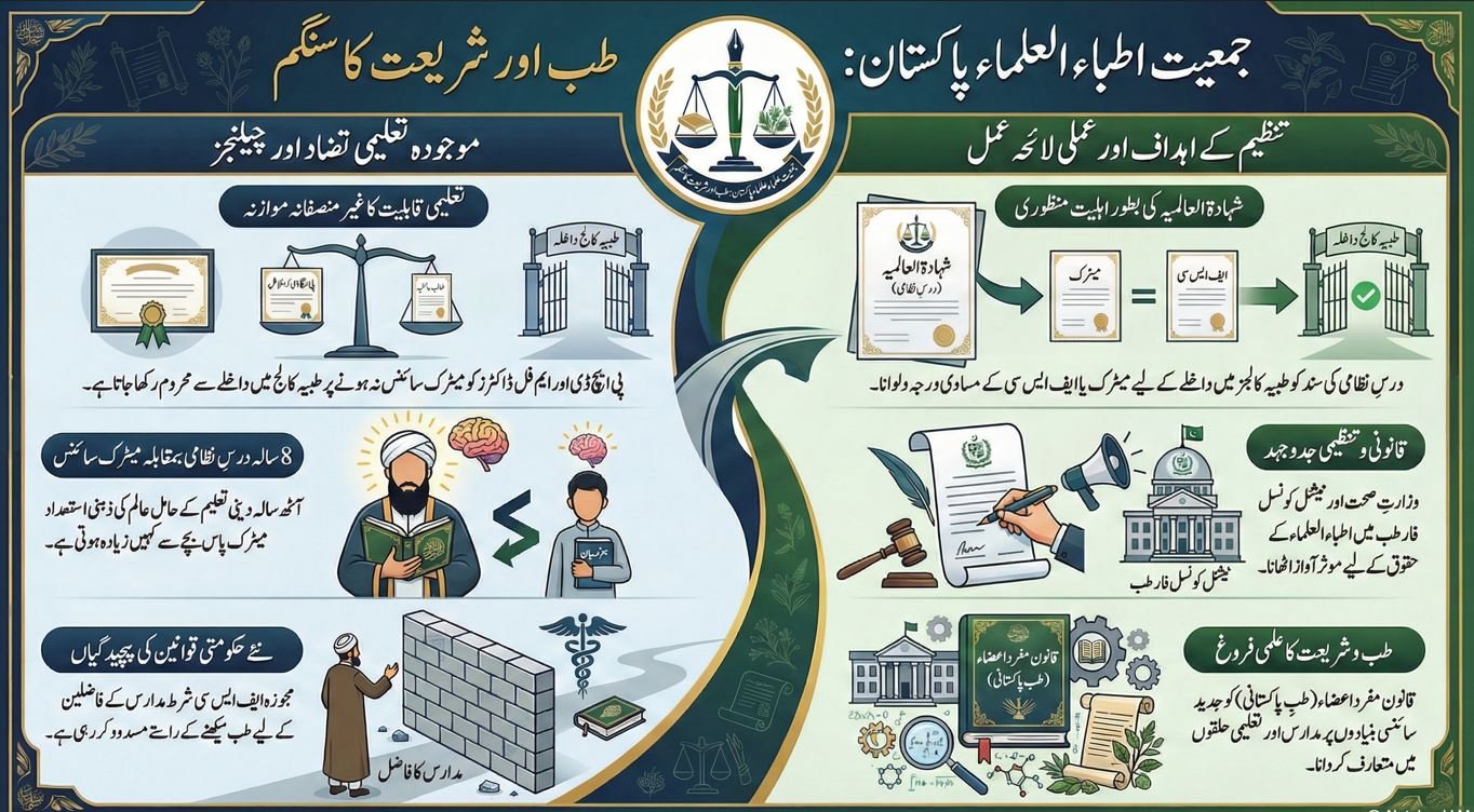برِصغیر کی تاریخ شاہد ہے کہ طب اور دین کا رشتہ ہمیشہ گہرا رہا ہے۔ ماضی میں ہمارے جید علماء کرام نہ صرف روح کے معالج تھے بلکہ جسمانی امراض کے علاج میں بھی کمال رکھتے تھے۔ وقت گزرنے کے ساتھ ساتھ علمی و پیشہ ورانہ خلا پیدا ہوا، جس کی وجہ سے دینی اسناد رکھنے والے اطباء کو وہ قانونی اور سماجی مقام نہ مل سکا جس کے وہ حقدار تھے۔ اسی خلا کو پُر کرنے اور “العلماء اطباء” کی بکھری ہوئی قوت کو ایک لڑی میں پرونے کے لیے ایک توانا آواز کی ضرورت محسوس کی جا رہی تھی۔