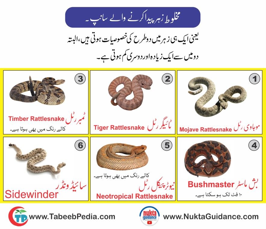 | 2 | ماساساؤگا (Massasauga) | شمالی امریکہ میں پایا جانے والا چھوٹا ریٹل سنیک۔زہر خون میں جمنے والے خلیات کو نقصان پہنچاتا ہے۔ |