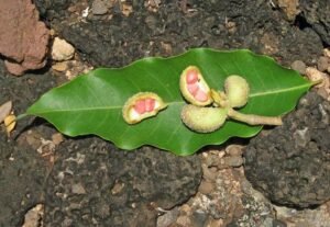 پھل مخروطی شکل کا جھرمٹ کی صورت میں ہوتا ہے، جس کی لمبائی 6 سے 30 سینٹی میٹر اور ہر جھرمٹ میں 6 سے 40 تک علیحدہ علیحدہ پھل ہو سکتے ہیں۔ ہر پھل لکڑی جیسا، ہلکا بھورا اور 1.5 سے 2 سینٹی میٹر لمبا ہوتا ہے، جس میں 2 سے 6 بیج ہوتے ہیں۔ بیجوں کے گرد سرخ یا گلابی گودا ہوتا ہے، جو باریک سفید ریشے پر لٹک رہا ہوتا ہے۔