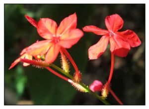 - Plumbago rosea (syn. Plumbago indica) ۔ گہرے سرخ یا گلابی پھول۔