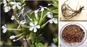 Plumbagin: یہ ایک نَیف تھاکوین (naphthoquinone) مرکب ہے جو اس پودے کی جڑ اور پتے میں پایا جاتا ہے۔ یہ مرکب اینٹی مائیکروبیل، اینٹی کینسر، اینٹی انفلامیٹری اور اینٹی آکسیڈینٹ خصوصیات رکھتا ہے۔